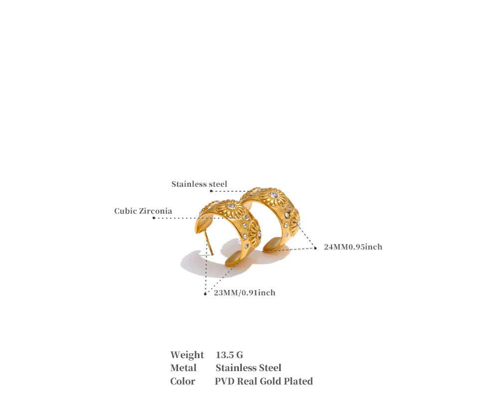Celebrate in full bloom. The Festival Flower Hoops feature semi‑circular gold hoops embossed with intricate floral patterns and accented with sparkling cubic zirconia's. Their ornate design makes them perfect for dancing through festivals and summer nights. waterproof and hypoallergenic, these hoops are designed for carefree style that lasts.